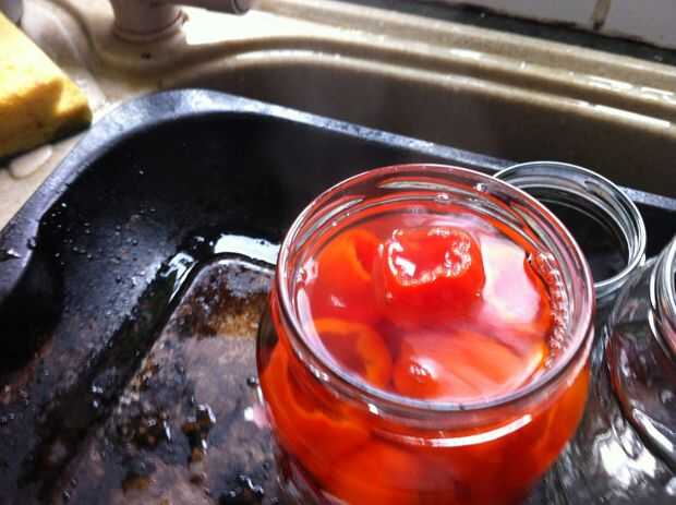 Asegúrese de que si no has cortado los pimientos que no tienen bolsas de aire en ellos. Yo les asomó con una cuchara esterilizada hasta que las burbujas subiendo.
