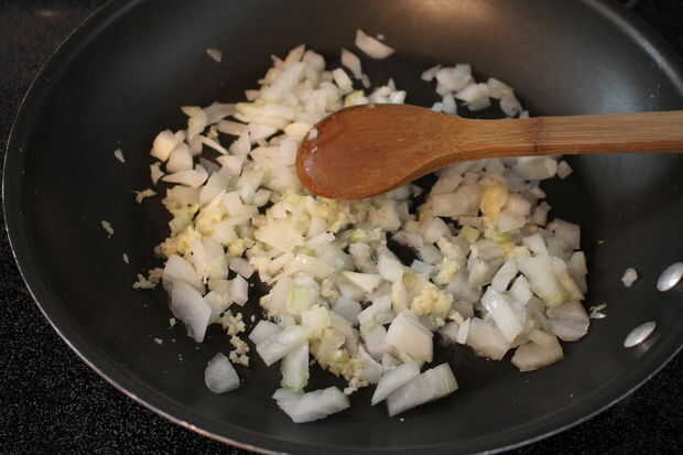 Saltear el ajo y la cebolla en una sartén.