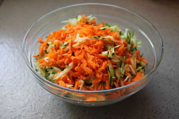 Después de 20 minutos, echar el calabacín, la zanahoria y el pimiento picado en la olla con el arroz. Cocinar con la tapa por 10 minutos más.