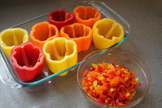 Cortar las tapas de los pimientos. Deseche el tallo y las semillas y luego picar las tapas restantes. Colocar los fondos de la pimienta en un plato de lasaña olla o cazuela.