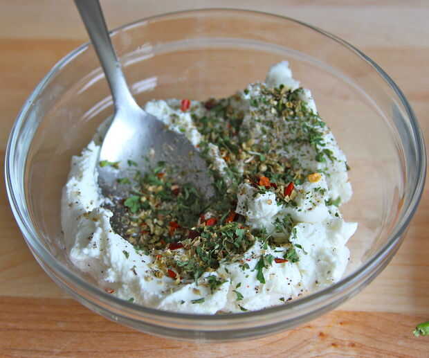 Utilicé varias pizcas de perejil seco y un par de hojuelas de orégano y pimienta roja pinches. Y luego añadí un poco de pimienta negra molida porque usar cantidades excesivas de pimienta negra en todo :D