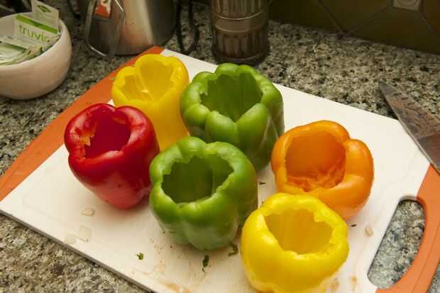 Tomates rellenos y pimientos, son saludables, puede ser comido caliente o frío y son una maravilla para un almuerzo de oficina. Son más sabrosas el día después de que se han hecho y puede ser acompañado con una cucharada de yogur griego .Paso 1: ingr