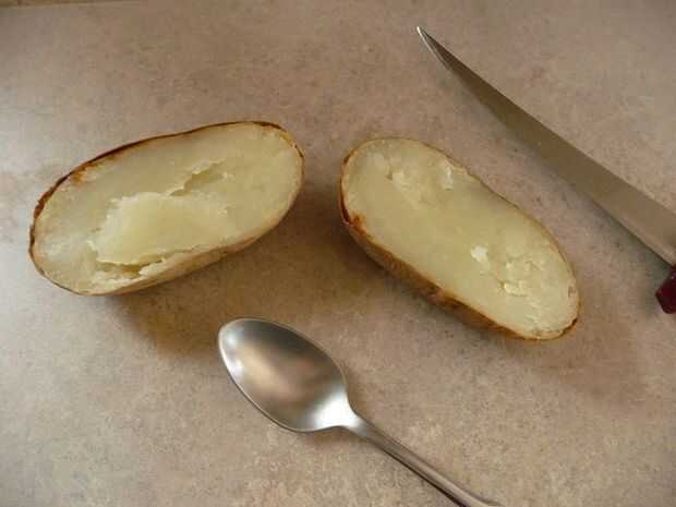 Cuando la patata esté lo suficientemente fría como para manejar, rápidamente cortar por la mitad con una hoja afilada y serrada no. Hojas dentadas rasgan la piel y eso no es bueno. ;-)