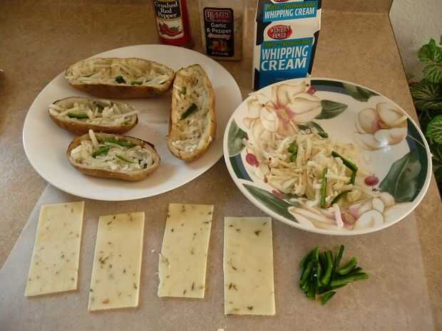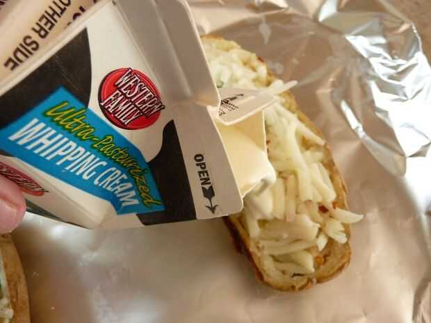 Lentamente vierta alguna crema sobre cada papa. Debe tomar 1-2 cucharadas cada una, dependiendo de su tamaño.