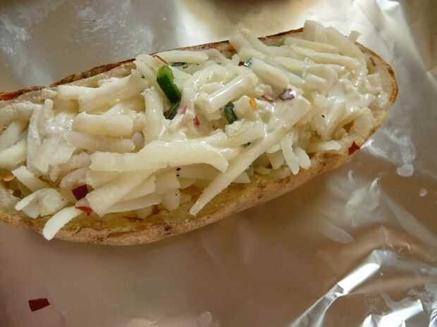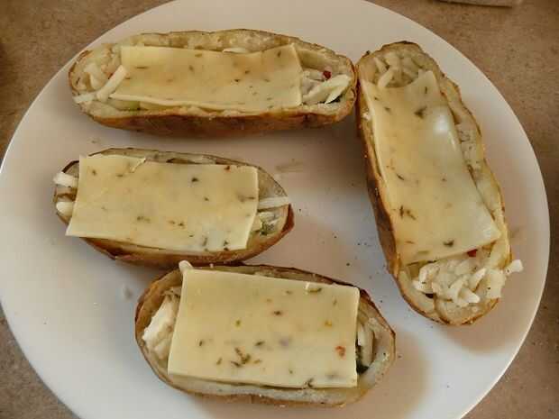 Cortar las rebanadas de queso Monterrey Jack por la mitad y coloque 1/2 rebanada sobre cada papa.