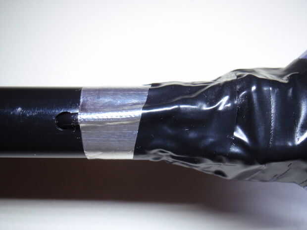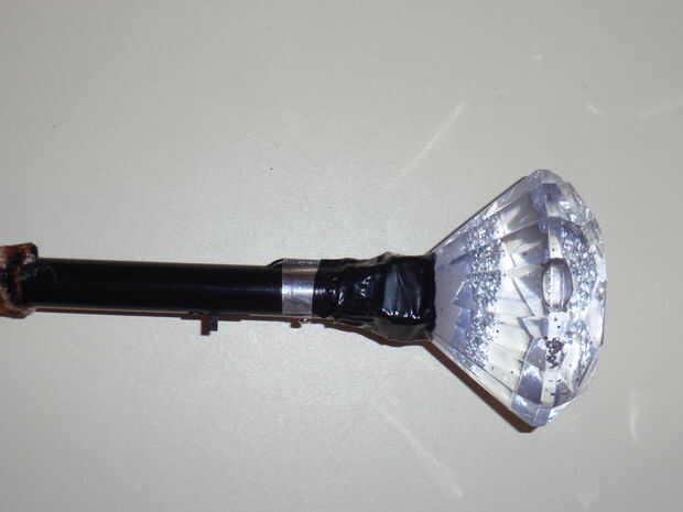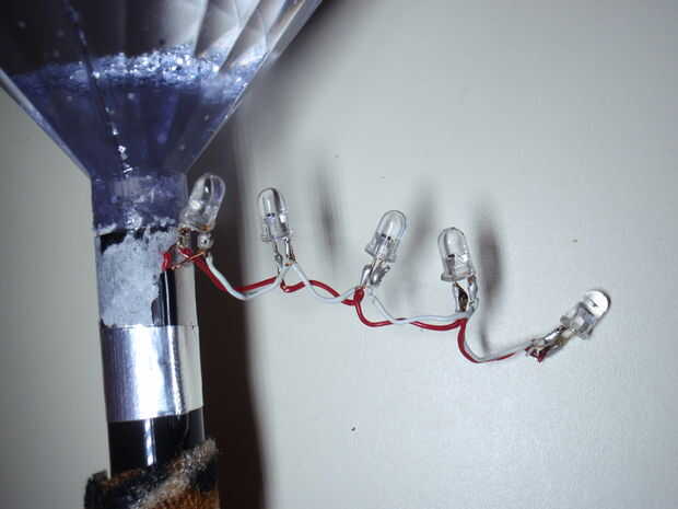 Perfore un pequeño agujero para el cable que se conecta a los leds (ver foto) también haga correr el cable a través de la caña lo suficiente para extender a la parte inferior de la caña de los leds.