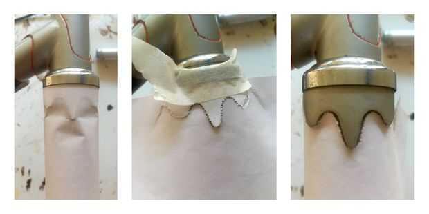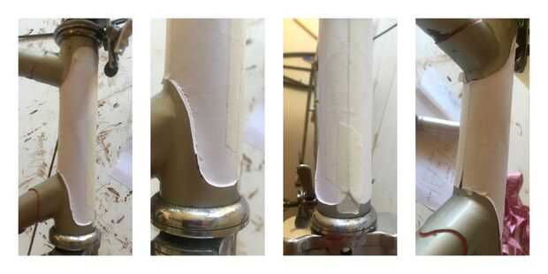 La forma en que hizo esto fue agarrando un manojo de papel... Ahora, usando una pieza me puso en el extremo de las barras y trató de rastrear los contornos primero apenas con mi dedo y luego había perforada con mi punzón. A continuación recorto y comprobar si todo igualado. Las imágenes explican muy bien, demasiado. Luego medí el grosor y la longitud de las barras ellos mismos. La mayoría era los mismos, excepto por la horquilla delantera y algunos bares en la parte posterior. Así que para obtener la forma cónica, sólo había medido en intervalos y marcadas las medidas en el papel, creando el patrón. Entonces los recorte y sostener alrededor de las barras que compruebe si se ajustan. Si hubo demasiado o demasiado poco, volver atrás y añadir o restar algunos. Este proceso fue bastante lento. Más que la costura real.