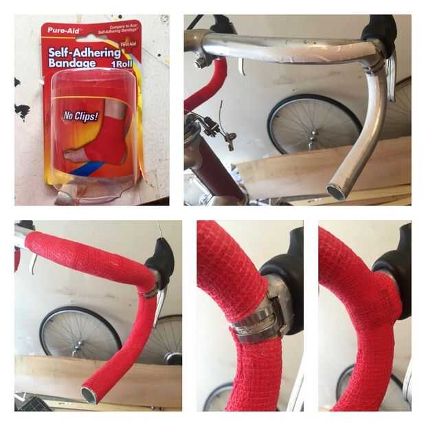 Lo primero, necesita sacar cualquier manillar viejo abrigo y amortiguación y la suciedad que viene con él. Me dijeron que debo poner un cojín debajo de la envoltura, pero creo que es solo preferencia, así que he optado por un compromiso. Utilicé algunas cintas de deporte también encontré en el almacén del dólar (ya sé, debe ser una enfermedad). Realmente funcionó muy bien, porque una de sus propiedades es a pegarse a sí mismo y es tan flexible que envuelve muy bien la barra con curvas.