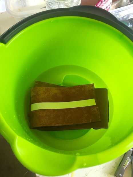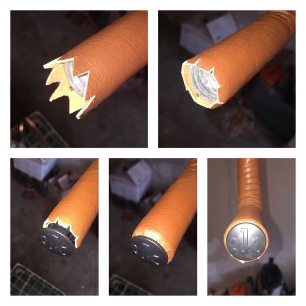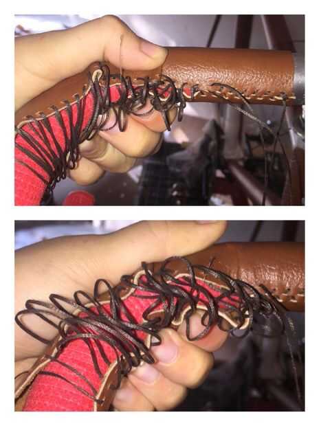 El cuero es más fácil ocuparse cuando empapado en un poco de agua y luego dando golpecitos secos previamente. Todo fácil hasta aquí. Entonces comencé a envolviéndolo... El primer mango realmente me tomó 4 horas a averiguar qué demonios estoy haciendo. Que es cuando decidí que una puntada de la Cruz no iba a funcionar para esto (tal vez más adelante cuando hago algunos más) y opté por una puntada de béisbol (no sé el nombre oficial). Hizo sólo mucho más fácil mi vida. La segunda empuñadura me llevó sólo una hora. El truco es 1. no dar para arriba, 2. ir adelante y atrás unas cuantas veces, 3. torsión, 4. montón de fuerza.