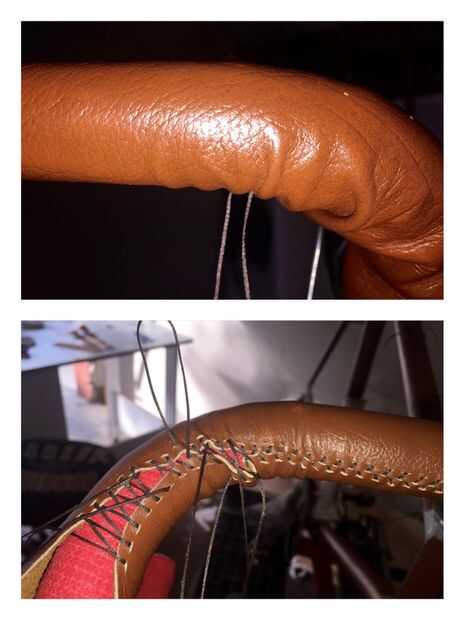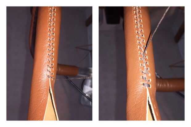 OK, esto es lo que hice exactamente. Yo primero apretar la pieza al principio y luego fue a continuación muy libremente con la puntada de béisbol. Manteniendo suelto se verá muy desordenado al principio, pero ayuda mucho más tarde. Faltarán hilo rápidamente, así que coserlo suelta, así que cuando llega al final, empezar a ir hacia atrás y apretar. Dong, utilice los dedos y empujar el cuero a ayudar a cerrar para arriba. No te preocupes si no cierra inmediatamente, me dirigí de nuevo a un par de veces.