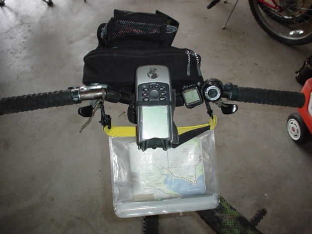 me encantan los gadgets, como usted probablemente sabe por ahora. En el manillar tengo un montaje de los GPS, ciclo Computadoras y bell (obligatorio por ley). Si un mapa es necesario, puedo usar un poco de paracord para colocar un mapcase, y para una diversión puede colocar un termómetro a las barras utilizando el trozo de tubo interno omnipresente. También tengo un bolso de bar la manija para artículos más pequeños utilizados.