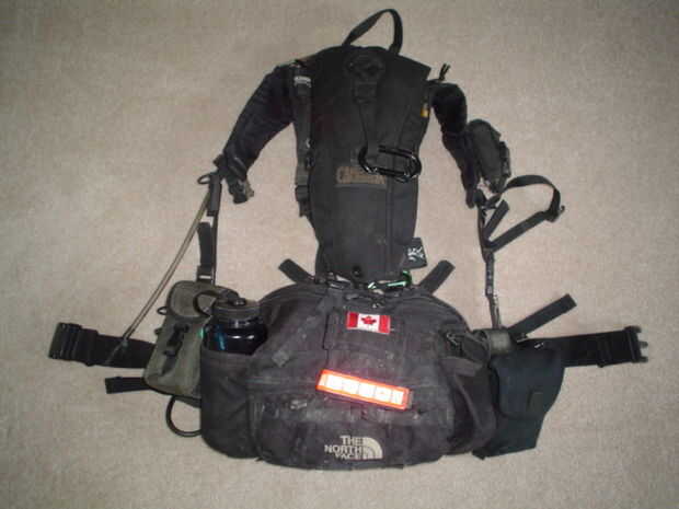 Para el verano, usar lo que yo llamo cariñosamente mi cinturón de batalla: A Norte lumbar mascarilla, con agua, a prueba de viento chaqueta y cosas de primeros auxilios. Es suficiente para un agradable día en la carretera. Dependiendo de la distancia y ubicación, añadir más a la cintura. (Lo sé, parece un poco... militante pero qué digo!!)