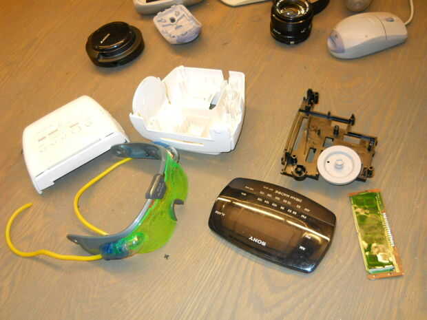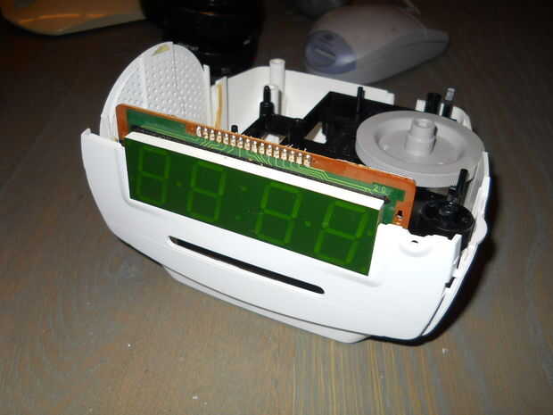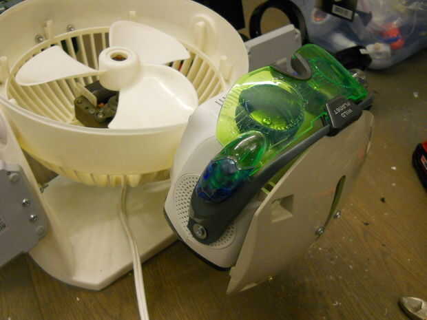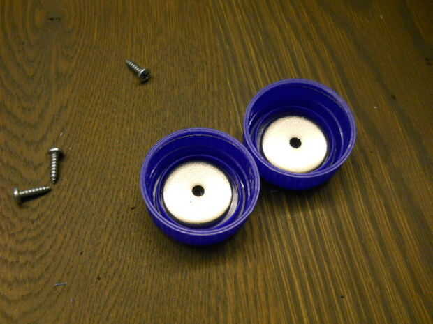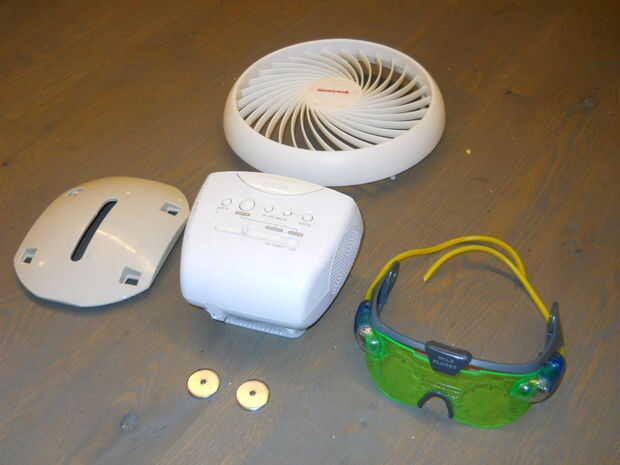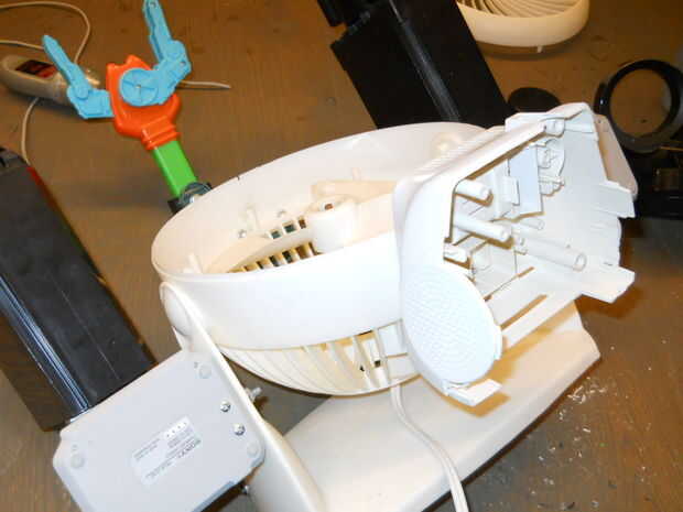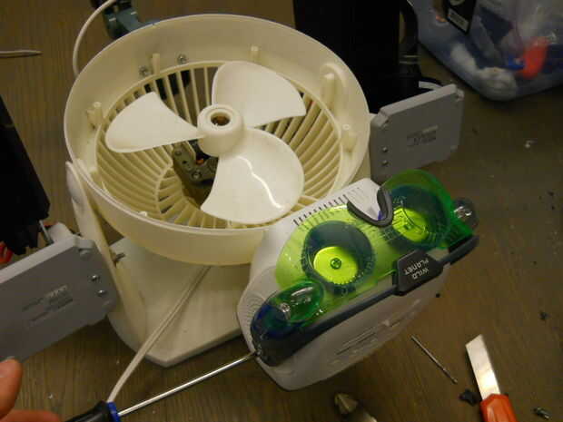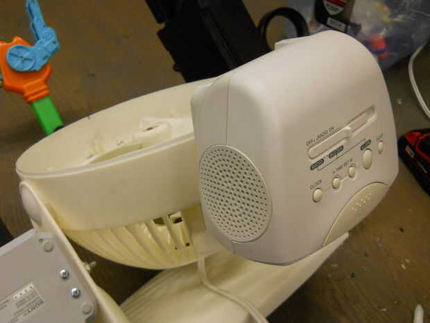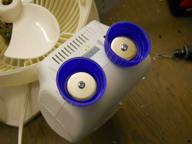 En primer lugar, os adjunto la caja del reloj de radio en el ventilador, luego me fijo los ojos. Más tarde, os adjunto los vasos de plástico y la base.