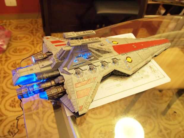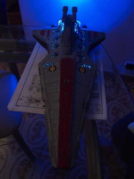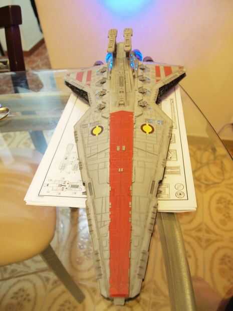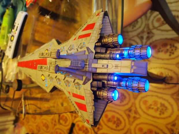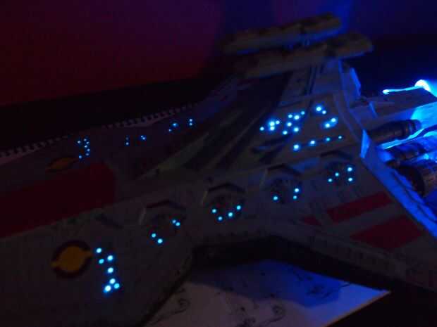 El cable se pasa a través de un orificio en la parte inferior del fuselaje, y para evitar que se afloje, un nudo se hizo desde dentro de la nave, creando un bloqueo físico. Sólo entonces conectado a la energía de suministro de cables de los LEDs. Con todo conectado, cerca de la nave como el manual de instrucciones.