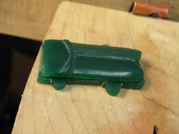 La tapa es ahuecada de un pequeño bloque, con suficiente grosor en la parte superior e inferior para que coincida con la talla con el resto de la caja. Para combinar las dos mitades de la caja de coche, quería extender la tapa sobre el cuerpo, con un wingcase buscando brida. He cubierto la parte superior del cuerpo de coche con papel de estaño y trabajó la cera caliente directamente sobre él, asegurando un gran ajuste.