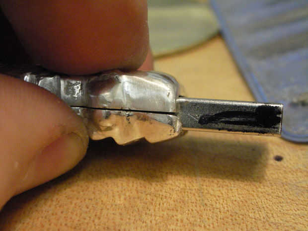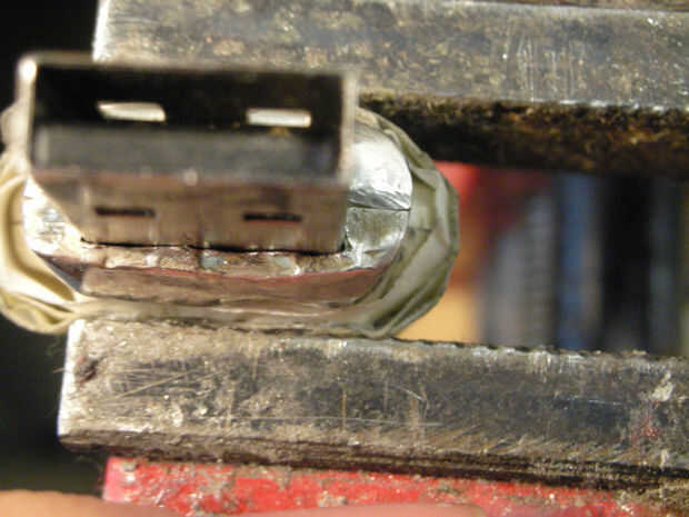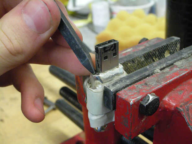 Hay una solución simple y elegante. Una vez que su caso se cierre remachado, tomar su golpe o persiguiendo a herramientas y utilizarlas para cerrar la costura! El proceso es muerto simple, aunque un poco difícil de describir. Lo que está haciendo el golpe, en esencia, es sólo masaje el metal en una ubicación diferente. Con pequeños golpecitos del martillo, apenas Junte las costuras más cerca. Esto fue realmente útil para cerrar las brechas en el enchufe usb. Tómese su tiempo y hacer tan perfecta como sea posible, porque cuando la gente no puede encontrar la costura realmente no pueden averiguar cómo han construido esto.