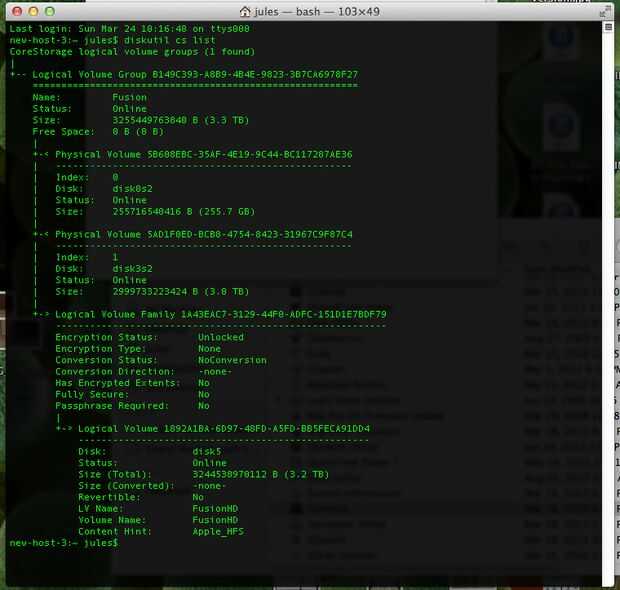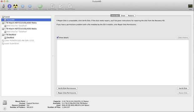 Ahora ir a utilidad de discos y usted debería ver la unidad de fusión que creó. Formato y luego para estar seguro, reparar permisos de disco.
