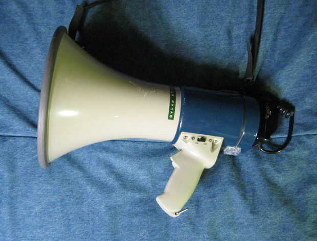 Haz un megáfono. Aquí estoy usando un Radio Shack 32-2038A 10 vatios uno. Es bastante ruidoso.