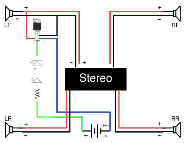 Cada altavoz tiene su propio transistor, resistencia, azul led y led verde. La tensión de alimentación positiva va a la resistencia que va al ánodo positivo que se conecta el ánodo led que se conecta al colector del transistor. El emisor del transistor se conecta al cable positivo de altavoces. El transistor Base se une a los dos alambre de la tierra de la alimentación y el negativo del altavoz. Eso es para una unidad. Hacer esto para cada altavoz y la conexión está completa. Una vez conectado la música está lista para probar.