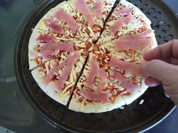 Las tiras se colocan encima de la pizza de la tienda hecha de antemano.