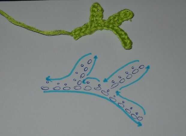 seguir con 5 ch, ir con 6 sl;