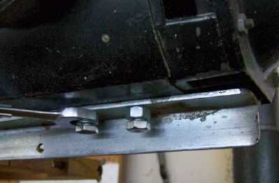 he utilizado un trozo de hierro de ángulo de 1 pulgada de 11 pulgadas de largo.  Perforé dos agujeros de 5/16 de pulgada en el hierro de ángulo para que coincida con los orificios en la parte inferior del motor.  Usé dos pernos de 5/16 de pulgada aproximadamente una pulgada de largo cada una y colocar una tuerca en cada uno antes de enhebrar en los agujeros.  Las tuercas se utilizan para colocar el ángulo de hierro contra la parte inferior de la sierra.