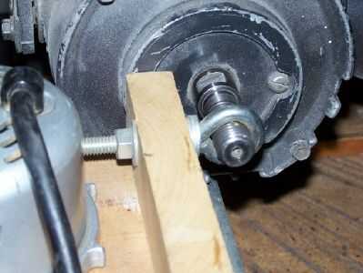 Un perno de ojo 5/16 de pulgada se ajusta estrechamente alrededor del eje motor de la sierra.  Quizás tenga que abrir los ojos un poco para hacerla deslizar sobre el eje.  Observe las arandelas usadas como espaciadores entre el ojo y la parte posterior de los miembros del marco vertical.  Entre este y el ángulo de hierro, el router se monta muy bien.  Naturalmente, el motor de la sierra no funciona cuando el router pin esté en uso.