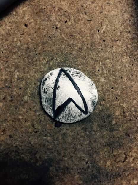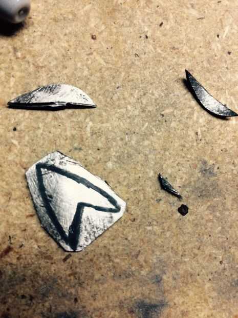 Utilice un rotulador negro para dibujar en el contorno de la capa superior de la insignia. Lijado la superficie un poco para hacer el marcador más fácil de ver en primer lugar, porque el níquel es probable que se ponga negro después de calentamiento y martilleo. Puede utilizar una plantilla o no (yo no). Use Cizallas o tijeras para cortar más o menos la forma de la lata.