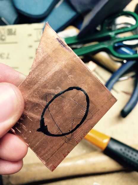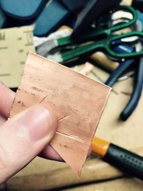 Tome una sección de tubo de cobre un par de pulgadas de largo y corte a lo largo de un lado usando tijeras o un poco de corte. Utilicé una combinación de pinzas, un tornillo de banco pequeño y el "yunque" para aplanar el tubo en una hoja. Ser conscientes del daño que causa a la superficie, como cualquier estropear tendrá más tiempo para sacar más adelante. Colocando la tubería entre pedazos de cuero podría ser una buena manera de proteger el metal.