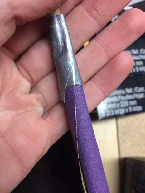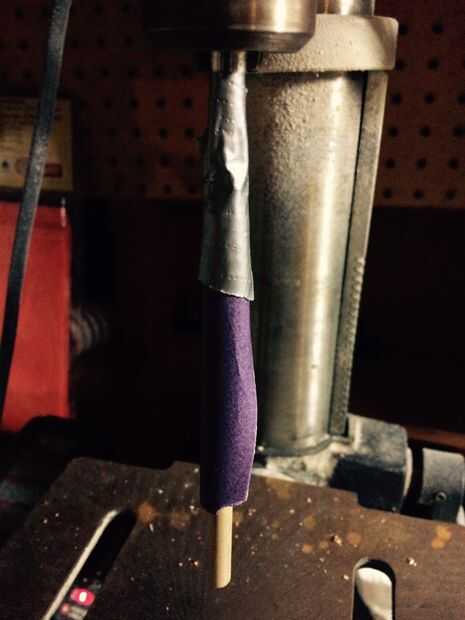No tengo mucho equipo para lijar y pulir, usé lo que tenía. Tomé una madera pasador, envuelto en una hoja de papel de cuadrícula 180 alrededor de él con la cinta y arrojó en el taladro. El resultado es de una lijadora de aleta improvisado que es sorprendentemente eficaz. Tenga cuidado notar que hará girar al envolver la dirección. Si tienes más robustos métodos de hacerlo, por todos los medios, utilizarlos.