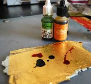 Añadir unas gotas de tintas de alcohol en la parte superior de la hoja. remolinar alrededor con un q-Tip. Rocía con la mezcla de solución o alcohol isopropílico.