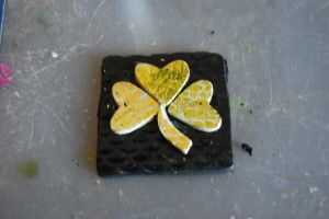 Hornee según las instrucciones en el paquete de arcilla. Una vez que ha curado y enfriado, mezclar algunos resina de hielo (hacer sólo una cucharada, y puede cubrir 2-3 pines) Aplique una capa de resina de hielo en la parte superior del perno, que cubre el trébol y fondo totalmente. Deje que esta cura durante la noche. Añadir su pin nuevo o bala al día siguiente con algún pegamento y disfrutar!