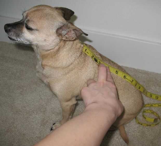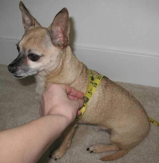 Consejo: Si no tienes una cinta métrica, medir una forma redonda puede ser complicado. Utilice una longitud de cadena o cinta para encontrar la circunferencia de pecho y luego esa cadena sobre una regla o criterio para averiguar el tamaño del suéter de tu cachorro.