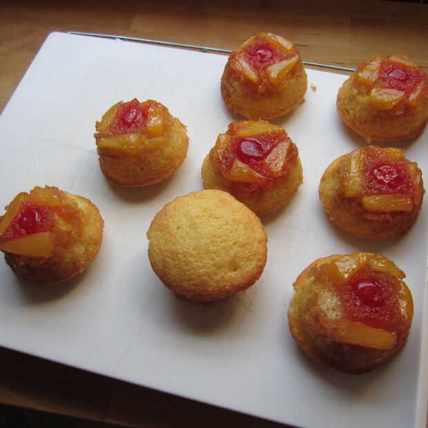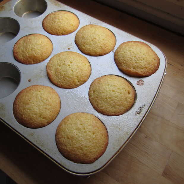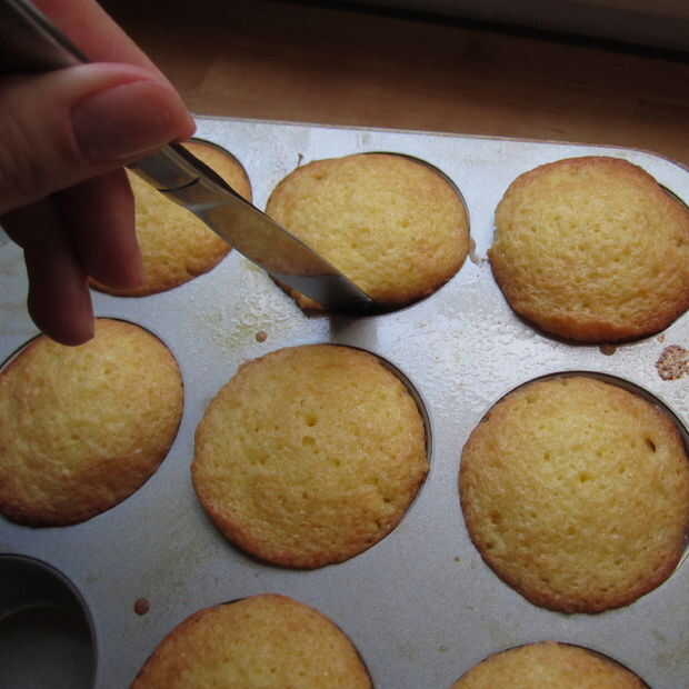 Vaya alrededor del borde de cada Magdalena con un cuchillo de mantequilla para ayudar a aflojarlos. Luego cubra los bollitos con un plato grande o una tabla de cortar y dale la vuelta! Esto debe hacerles venir agradable y fácil y en una sola pieza! Puedes ver uno de mina hizo un tirón. : P que está bien - sólo vuelva a montarlo con cuidado. : D