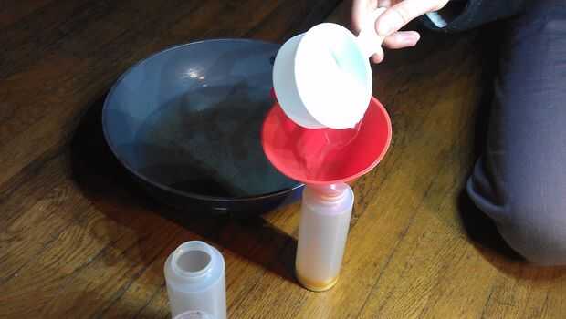 Hervir 2 cuartos de galón de agua a hervir. Apagar el fuego y añadir 1/2 taza de ceniza de soda. Revuelva hasta que se disuelva.