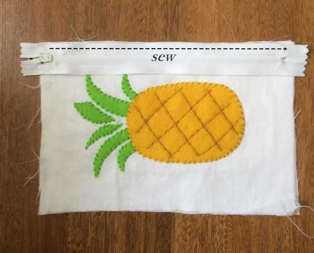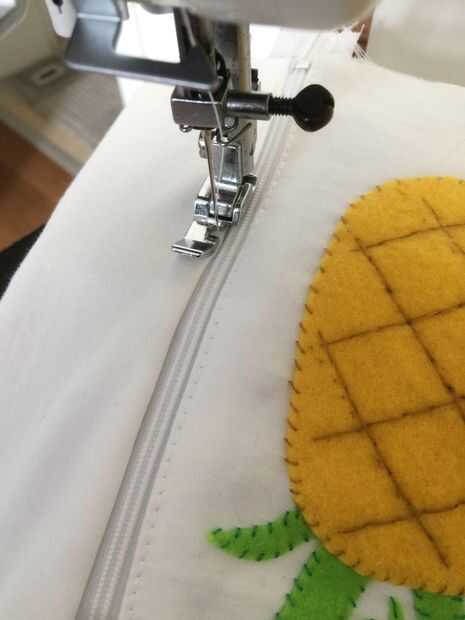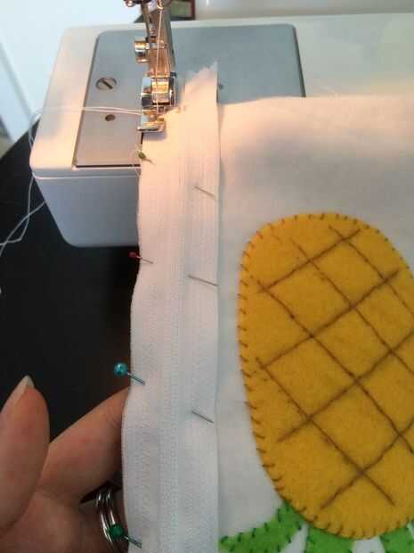 Coloque a la tela de la guarnición y coloque la cremallera en la parte superior. Coser como se muestra en la imagen usando un pie de cierre. Repetir lo mismo para el otro lado y parte superior coser la cremallera.