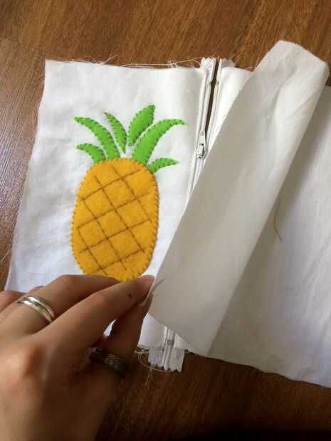 Abra la cremallera 3/4 del camino. Doble la bolsa para que el exteriores y telas de la guarnición son derecho lados juntos. Asegúrese de que coincida con esa cremallera en ambos lados. Coser como se muestra y corte las esquinas.