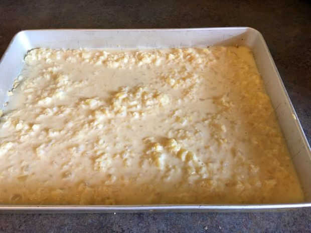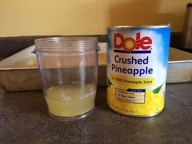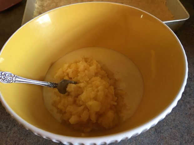 En un recipiente, mezclar la lata de leche condensada, piña machacada y un huevo grande.