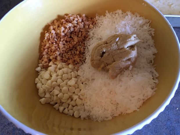 En un tazón grande combine los chips de chocolate blanco, coco, nueces de macadamia y 1/2 taza de la mezcla de la corteza.