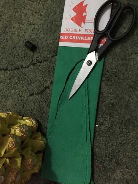Cortar hojas (tiras largas) de verde y pegamento en la parte superior botella y asegúrela con ayuda de hilo blanco.
