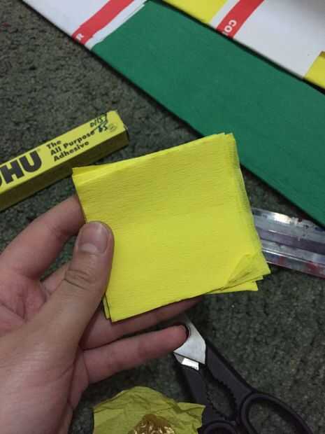 Cortar el papel crepé amarillo en cuadrados de 7 x 7 cm.