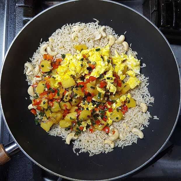 se trata de un plato flexible en cuanto a los ingredientes. Experimento con lo que tienes disponible. Aquí está una lista de los ingredientes que utilicé para este particular plato. 3 huevos 1 taza de capuchino de taza de capuchino arroz 1.5 de agua