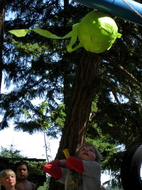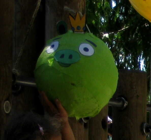Usé los cubos rojo y amarillos para representar el rojo y amarillo angry birds para los niños a colocar sus dulces de piñata en. También puede decorar las velas con pegatinas de Angry Birds. Después de unos golpes de los niños, algunas de papel crepe comenzaron a salir. Esto no fue es gran cosa. Añadir a la diversión y recuerde, estas son cuatro años de edad estaban hablando. También se puede ver bro bebé vestido para la ocasión en su verde cerdo get-up. :)