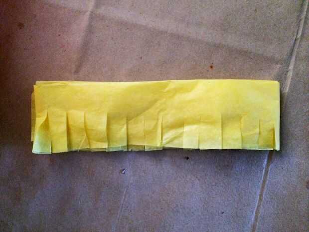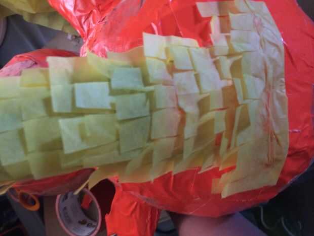 Papel de tejido realmente ayudó a Charmander se parecen más a una piñata. Me doblada y cortar una hoja de papel de seda en tiras. Entonces doblé los tira a lo largo y corte perpendicular 1/2 longitud cortes a lo largo de la longitud del papel de tejido. Luego abrió un poco la tira de tejido y reajuste para que muestre 2 capas de papel con flecos tejidos. Pegué la capa superior hacia abajo y esto ayudado con el ahorro de tiempo. Entonces simplemente cortar la tira según sea necesario para cubrir la piñata.