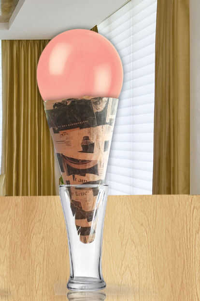 Soplar el globo y colóquelo sobre el cono. Coloque el cono en un vaso grande y luego papel mache el helado de la misma manera que hicimos para cono. Puede hacer 3 capas. Déjalo secar durante al menos 24 horas o durante la noche.