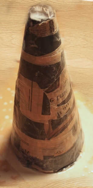 Vamos a iniciar el proceso de papel maché, tomar pedazos de 2 pulgadas de periódico uno por uno, sumergir en la mezcla de pegamento y empezar a colocarlos en el cono. Cubrir el cono entero de arriba a abajo y deje que se seque.