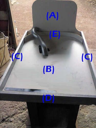 Ahora cortan su fina madera, cartón etc. (E) a la altura entre la base de madera aglomerada (B) y la parte superior de los lados (C) y permita suficiente longitud obtener una curva agradable incluso para la pelota a seguir al utilizar el émbolo. He arreglado mi madera curvada con dos tornillos muy pequeños en extremo y en un frotis de uñas líquidos donde el madera/cartón (E) se encuentra con los lados (C)