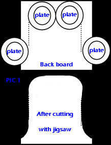 Simplemente tiene 4 platos redondos y trazada alrededor de ellos para conseguir el efecto que ver y recortar con una sierra de calar. Un par de cosas que debe recordar es empezar el corte que desea por encima de la altura de los lados para que tenga algo para atornillar la parte posterior y los lados en forma. (Ver foto 1 arriba)