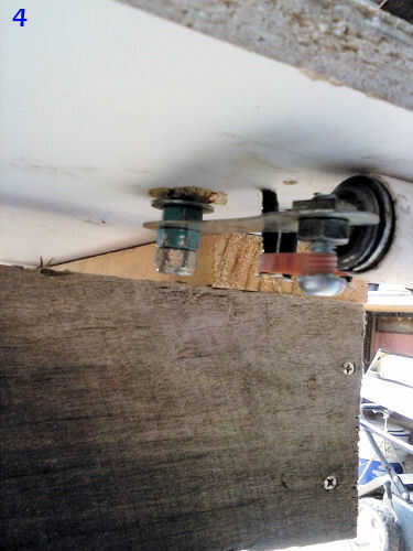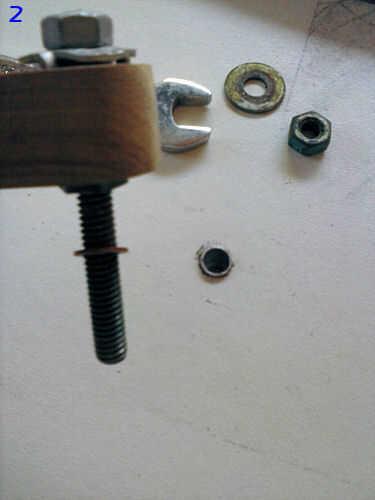 Golpee ligeramente el perno a través del orificio en la base del tablero y de debajo de añadir una arandela y otra tuerca y apriete así como la aleta tiene la tensión un poco pero vueltas dejar de fumar fácilmente. Añadir el soporte plano pequeño y la otra tuerca. Apriete las tuercas de dos últimos cara a cara que tiene el soporte entre él. En el agujero en el otro lado del soporte se pueden añadir el pequeño tornillo y tuercas como arriba. Esto es para la banda elástica que se tense las aletas. (Foto de referencia 4)