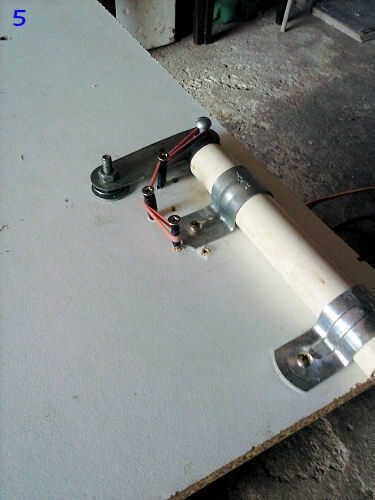 Cortar dos trozos de conductor eléctrico 32mm a 180mm de largo y colocar a los lados con los soportes de 32mm y tornillos pequeños. Cortar dos tramos de palo de escoba a 220mm de largo. Esto debe encajar perfectamente en el tubo de 32mm pero ser lo suficientemente suelta para moverse libremente. Necesita para que el palo no volar cuando se retrae la venda de elástico del tornillo una arandela grande hasta los confines de interior palo de escoba. Atornillar las tapas de botellas para el exterior del palo de escoba y los que hay que hacer aquí es aparte de unos tornillos para asegurar los elasticos. (Foto de ref: 4, 5)